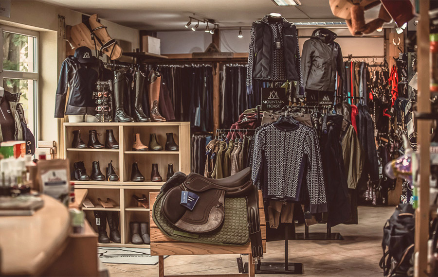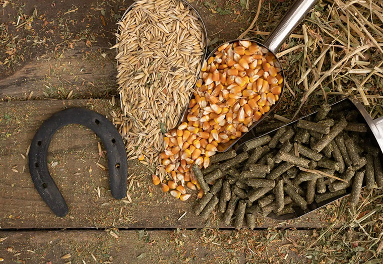 Sortiment an Futter und Reitsportartikel.